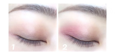 第一步:先用肉粉色眼影在眼部打底,更利于后面的显色。眼尾三角区域用晕染刷蘸取少量的桃粉色慢慢晕染开来,注意与肉粉色晕染自然。
