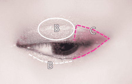 第二步:用第三个带闪的深粉色加深在眼尾和下眼尾,用第二个带闪的浅色提亮卧蚕和眼皮中间的部分。