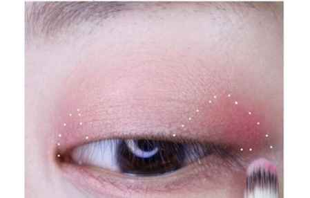 第一步:用大号眼影刷沾取少量的粉色眼影大面积的涂抹在上眼皮,画出眼窝的位置,这里颜色一定不要太深,浅浅的就好,而且最好用哑光眼影,才不会显眼肿。