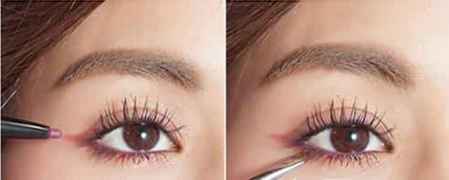 Step 3:下眼线同样是用酒红色的眼线胶笔做勾勒,从下眼头沿着眼睑睫毛根部轻轻地画上,于眼尾处往上勾勒线条。