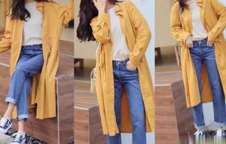 特别亮眼吸睛的姜**风衣,薄款的设计,很适合不冷不热春夏的天气,宽松的版型,可以遮掩肚子的小赘肉,过膝的长度,非常时髦又有型的,内搭搭配T恤和翻边的烟管裤是很日常的穿搭,高腰的裤子,翻边的九分裤长,很适合矮个子的女生,这么一身清爽干净的穿搭,打造出一股干练洒脱的既视感,配合一双运动鞋鞋,想不吸睛都好难。