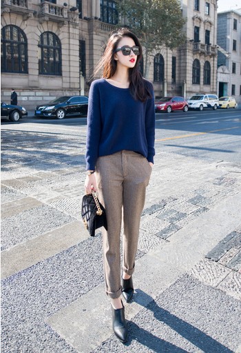 这件韩版的纯色毛衣非常好看,穿在身上也立显大牌气质,藏蓝色在今年非常流行,也很衬肤色。下半身搭配一条格纹铅笔裤,非常有时尚街拍的感觉,这种混搭的穿法也是很显瘦哦。