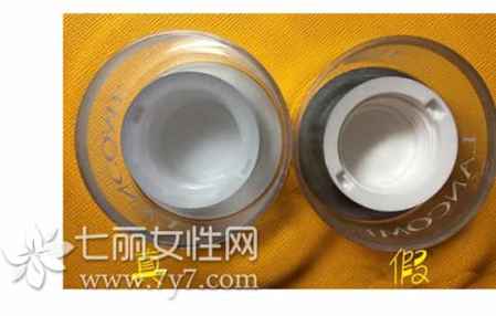 真的兰蔻粉水瓶盖的内部材料为白色透明的材质,而假的兰蔻粉水则是白色塑料的,且非常的不透明哦,将两个瓶盖摆在一起,是不是觉得假的兰蔻粉水瓶盖脏很多呢?