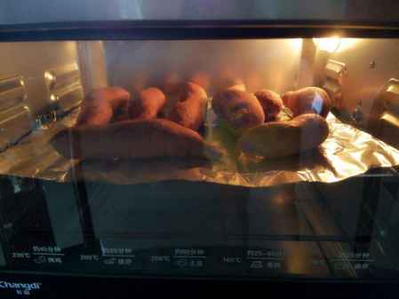 4、烤箱210度预热10分钟,然后将红薯放入预热好的烤箱中层,烘烤的温度和时间仅供参考,根据红薯的大小和多少来调整。