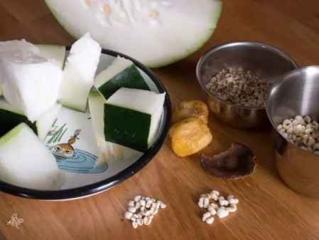 1. 冬瓜洗净,连皮一起切厚块,薏米洗干净沥水备用,陈皮泡软;