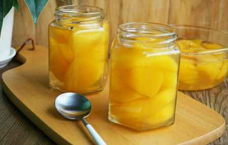 5、将煮好的黄桃果肉装入准备好的玻璃瓶中,果**瓶口8成满左右。