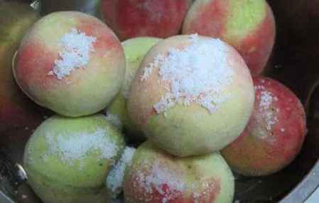 将桃子放入盐水中浸泡五分钟。浸泡后,我们会发现水面上漂浮着许多桃毛。接下来用手轻轻搓洗桃子表面。注意桃子皮非常脆弱力度不应太大以免桃子皮破损。然后再用清水清洗干净沥干水分就可以吃了。