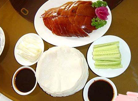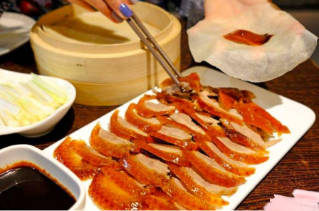 北京烤鸭:北京烤鸭好不好吃,和鸭子的品质高低和厨师的手艺有着分不开的关系,北京烤鸭不用填料码味,烤出的鸭子色泽金黄,外酥里嫩,最好吃的是鸭皮和连带着鸭皮的肉,但是北京烤鸭不能单独吃,要搭配荷叶饼、黄瓜丝、葱丝、酱料等一同食用,咬下去的时候,鸭油的香味充满口腔,又酥又嫩,主要是突出的就是鸭皮酥脆不腻,鸭饼的韧度合适。