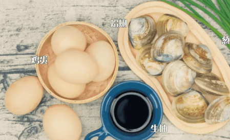 食材:鸡蛋6个,蛤蜊15个,姜片、葱花、盐、生抽适量