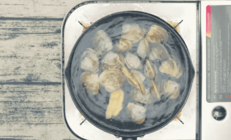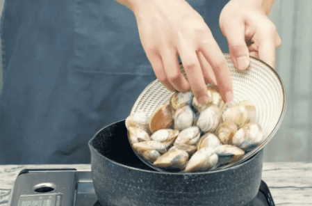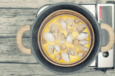 9、8分钟后拿开锅盖,码放上蛤蜊,剩余的蛤蜊肉也全部放入。