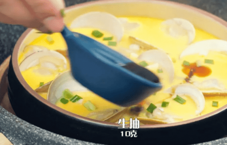 13、淋入1勺生抽,这道蛤蜊蒸蛋就完成啦。