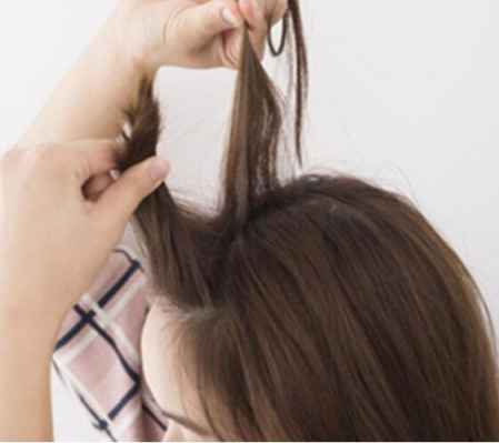 Step2:再把刘海的头发简单地抓起来,然后再用手来把头发给编成一个简约好看的一个小辫子的发型。