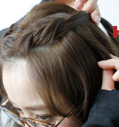 Step1:首先用手抓取中间的刘海,从发束中部开始,轻轻的扭转一周半。
