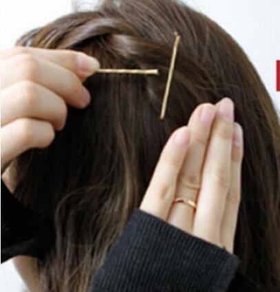 Step2:然后再将扭转的刘海像后翻,轻轻的向前推一下,这样可以使头发根部位拱起来,然后再用简单的发饰固定。