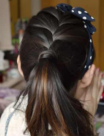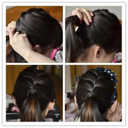 Step3:用大一些的黑色发圈把马尾绑的挺翘一些,当然你也可以选择用头发缠绕一圈哦。