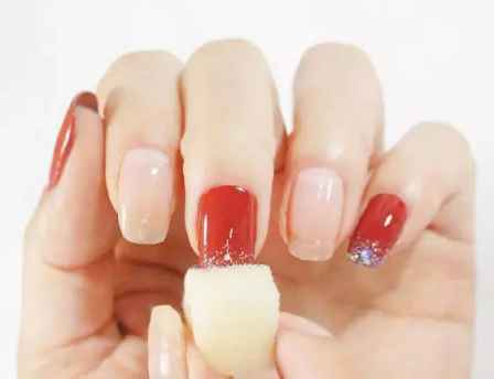 Step 2:用海绵沾取透明带彩色亮片的指甲油涂在中指和小拇指的指尖。