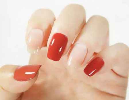 Step 1:给大拇指、中指以及小拇指全部涂上橘红色指甲油。