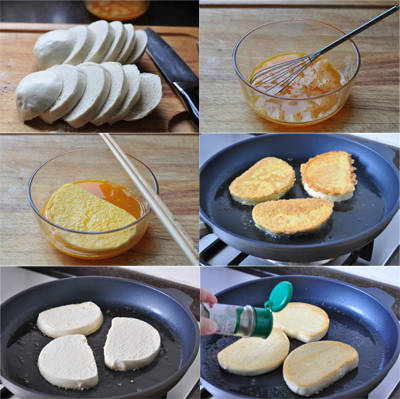3.将一部分馒头片逐片蘸上鸡蛋液,边沾蛋液边下锅;