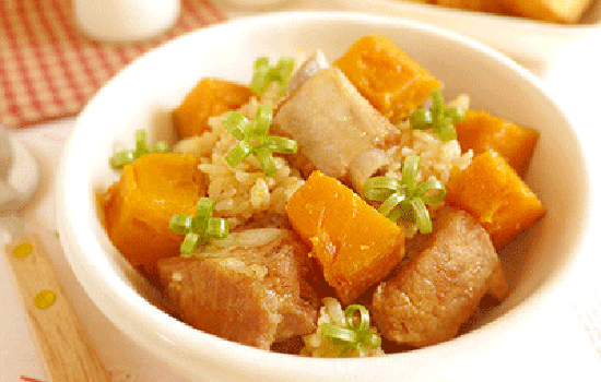 材料:南瓜、猪小排、大米、基本的配料适量、少量老抽,少量料酒。