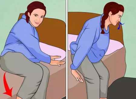 1、起床的时候,可以先移位膝盖,使他们来对**腹部前。移动**膝盖和**脚在床上的边缘。当你已经做起来了,在用**双臂作为支撑,摆动**双腿搭在床边,如下图。