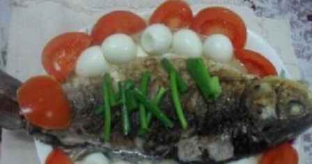食材:鹌鹑蛋8个,鲫鱼400克,黄酒10毫升,姜5克,葱,10克,食盐3克,鸡精2克,鸡油35毫升。