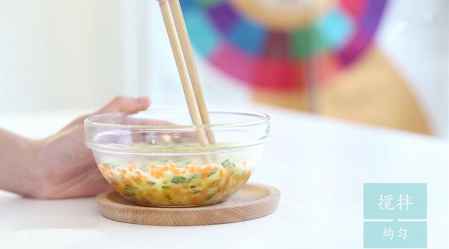 9、将胡萝卜碎、青菜碎加入熟米饭中,打入一个鸡蛋,搅拌均匀