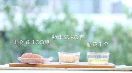 食材:里脊肉100g,熟米饭50g,蛋清1个,胡萝卜20g,香菇1朵,鸡蛋1个,玉米淀粉5g,青菜2片