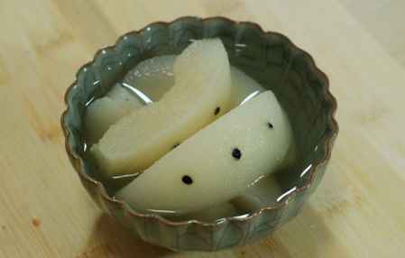 做法:在梨上戳几个小孔,每孔内**花椒1粒,隔水炖熟,待冷却后去掉花椒,食梨饮汁,可止咳,消痰定喘.