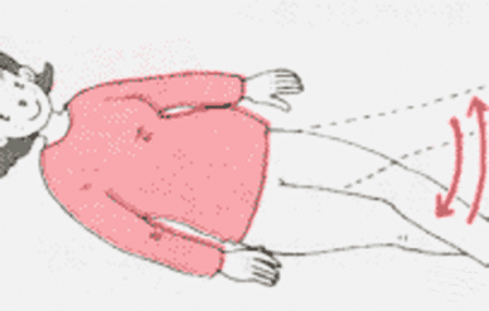 双肩紧靠在床上,仰卧,屈膝,双膝并拢,带动大小腿向左右摆动,要慢慢有节奏地运动。接着,左腿伸直,右膝屈起,右脚平放在床上。右腿的膝盖慢慢地向左侧倾倒。待膝盖从左侧恢复原位后,再向右侧倾倒。以后左右腿可交替进行。最好在早上、中午、晚上各做5-10次。此运动具有加强骨盆关节和腰部肌肉的强韧柔软的作用。