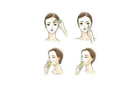 1、以螺旋手法轻刮,由眉心沿额头中线往上刮至美人尖;再由眉心往上画圈刮至额角及太阳穴。两边重复1至2次。