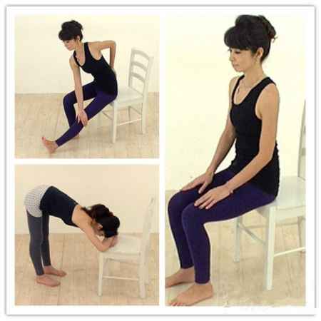 2、双手手臂放在椅子上,并且重叠在一起,然后让额头靠在重叠着的手臂上。保持这样的姿势1分钟。接着,拉伸从**内侧到腰部、背部、脖子后方的部位。
