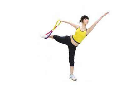 2、右手握住呼啦圈,用呼啦圈钩住右脚。左手向身体正前方伸展。