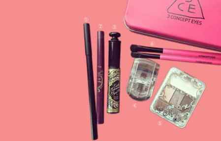 本次妆容所需工具为:3CE旋转眼线笔黑色、KISS ME极细眼线液笔黑色、恋爱魔镜睫毛膏纤长黑色款、无印良品睫毛夹、恋爱魔镜眼影盒、3CE中号和小号的眼影刷。