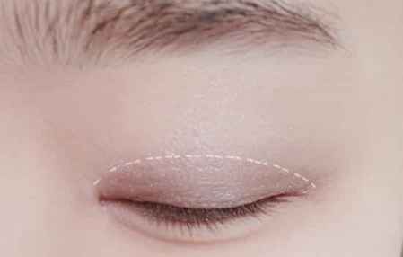将灰棕色眼影刷在如图所示的位置,眼影界线为双眼皮褶皱上面一点点。