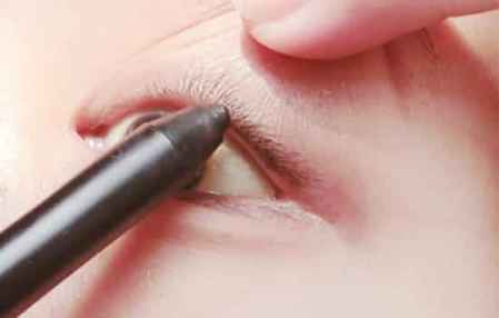 拉起自己的眼皮,用眼线笔画好内眼线,眼尾可以适当的拉长一点点。