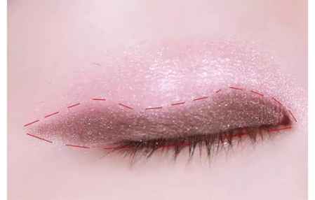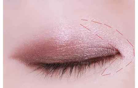 第一步:先用浅粉色打底整个眼窝,给眼皮提亮。然后用小号的眼影刷沾取深咖啡色眼影,沿着睫毛根,从眼头晕染到眼尾。