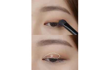第二步:沾取哑光橘色眼影,从眼头开始涂抹至上眼皮的2/3处,轻轻晕染开,不要有明显的边界线,可以少量多次,避免颜色不均匀。