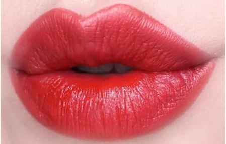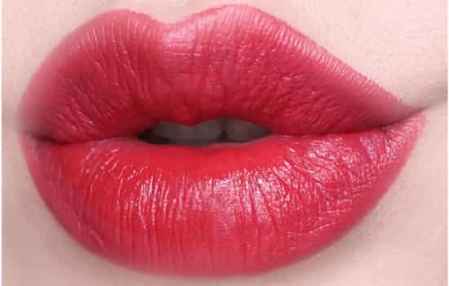 渐变唇妆450+999:如果你是黄皮但又不小心买了像450这样的裸色,没办法涂,那么不如像图中这样用450画唇周,再用一点999在唇部中间晕开,这样就得到一个很好看的渐变唇妆,有点像蜜桃的颜色,超级的**。