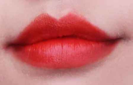 上嘴是十分衬托肤色的辣椒红,显得肌肤非常白皙,相较于橘色有着更高的饱和度,但是比正红色更加温暖。