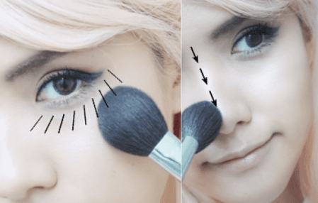 第一步:刷子沾取高光粉,先扫在双眼下方,再扫在鼻梁处。