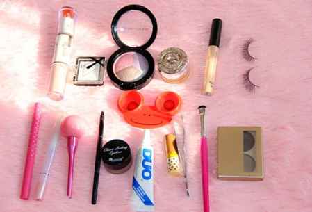 这是妆前所需的化妆品,包括了唇膏、粉底、高光粉、眼影、眉笔、假睫毛、眼线膏、腮红、眉粉**,这也是化妆的基本工具哦。
