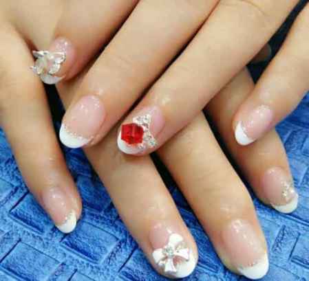 简单的白色法式美甲是最适合新娘不过了,再点缀上大块的蝴蝶结、**和珍珠,提升整款美甲的精致感,透明底色露出健康的肉粉色。这样的一款法式新娘甲,各位准新娘们一定都很喜欢吧!