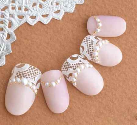 在新娘甲中,不一定要大面积使用白色。这款美甲大面积使用浅粉色,用以大小不一的珍珠、小颗金珠子做点缀,半面使用白色甲油在指甲上细细描画出大块的蕾丝图案,很适合穿婚纱哦!