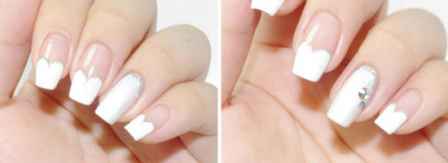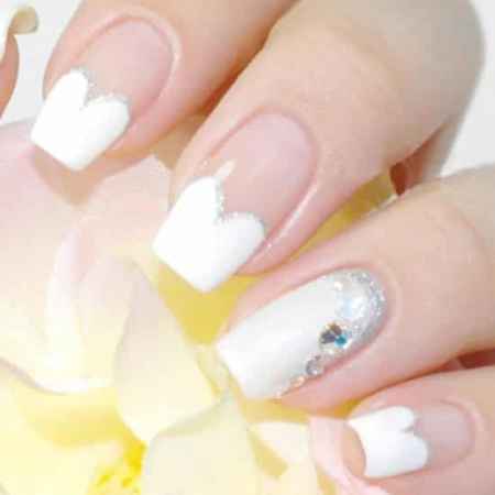 这款白色的新娘美甲,使用了心形元素和钻,心形是爱情的象征,钻则是衬托新**美丽。很适合白色婚纱的新娘。