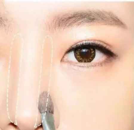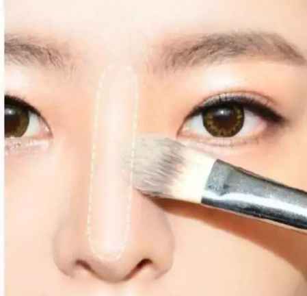 2、鼻梁**用比自身肤色稍亮一个色号的粉底或者遮瑕膏打亮,从上往下轻轻刷在**就可以,不要太显色,以免看上去不自然。