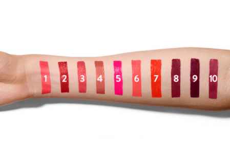 收藏价值满分的迷你奢金唇膏套装,十支色号分别为:Almost Bare、Lilac、Berry Rose、Neutral Rose、Retro Coral、Sunset Orange、Parisian Red、Raspberry Pink、Brocade、Crimson。从经典裸色到时尚炫色一应俱全,颜色都很实用。显色度非常好,上唇饱满浓郁,与手臂试色几乎没有分别。