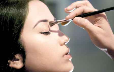 3、先用浅绿色眼影打底,然后用棕色眼影叠加在眼尾上。如果没有浅绿色眼影,用浅**或浅粉色眼影都是可以的,只要是浅色系。
