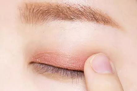 STEP3:手指蘸取玫瑰金色的眼影涂抹于双眼皮内侧。