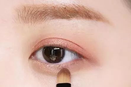 STEP5:豆沙色晕染至下眼睑的后半段,然后用金色珠光眼影晕染下眼睑的前半段。