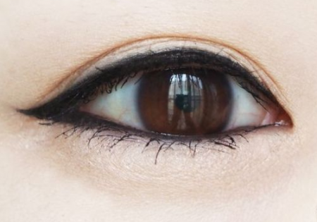 第二种平拉式眼线,让眼睛变长,如果五官集中的女生很适合这种拉长式的眼线那喜欢韩系眼妆的女生也可以选择这种画法,可以依眼头为基准线,然后拉长画,画拉长眼线的小技巧是可以睁着眼睛画,避免眼睛不小心又顺着眼型画了。